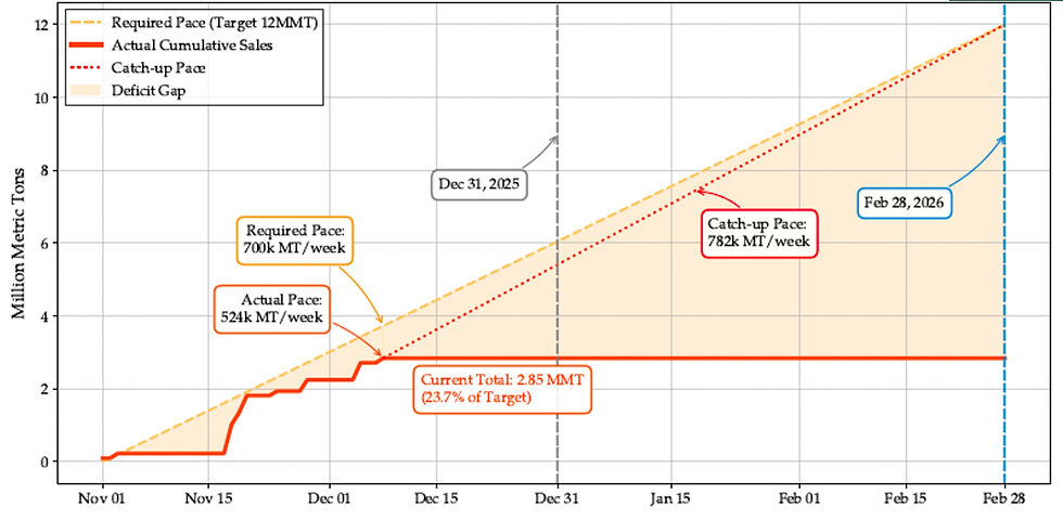 By early December, cumulative sales stood at 2.85 MMT, just 24% of the target, with actual purchases averaging about 524,000 MT per week versus a required pace of roughly 700,000 MT per week. Catching up would now require more than 782,000MT per week.